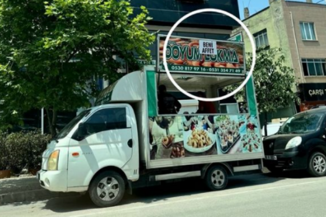 Lokma dağıtılan araçta yazılı olan 'Beni affet' yazısıyla vatandaş sevgilisinin kendisini affetmesini istedi.