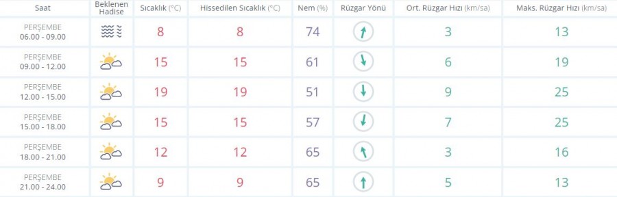 Meteoroloji Genel Müdürlüğü tarafından yapılan son değerlendirmelere göre: Ülkemiz genelinin parçalı ve çok bulutlu, Doğu Akdeniz'in doğusu, Orta Karadeniz kıyıları, Doğu Karadeniz ile Doğu ve Güneydoğu Anadolu ile Sinop, Karaman ve Niğde çevrelerinin yağışlı, diğer yerlerin az bulutlu ve açık geçeceği tahmin ediliyor. Yağışların, genellikle yağmur ve sağanak, Doğu Karadeniz'in iç kesimlerinin yüksekleri ve Doğu Anadolu'nun kuzey ve doğusunun yükseklerinde karla karışık yağmur ve yer yer kar şeklinde görülmesi bekleniyor. Yağışların yarın Batman ve Siirt çevrelerinde kuvvetli olması bekleniyor. Gece ve sabah saatlerinde Marmara, İç Ege ve Batı Karadeniz'in iç kesimlerinde pus ve yer yer sis bekleniyor.
