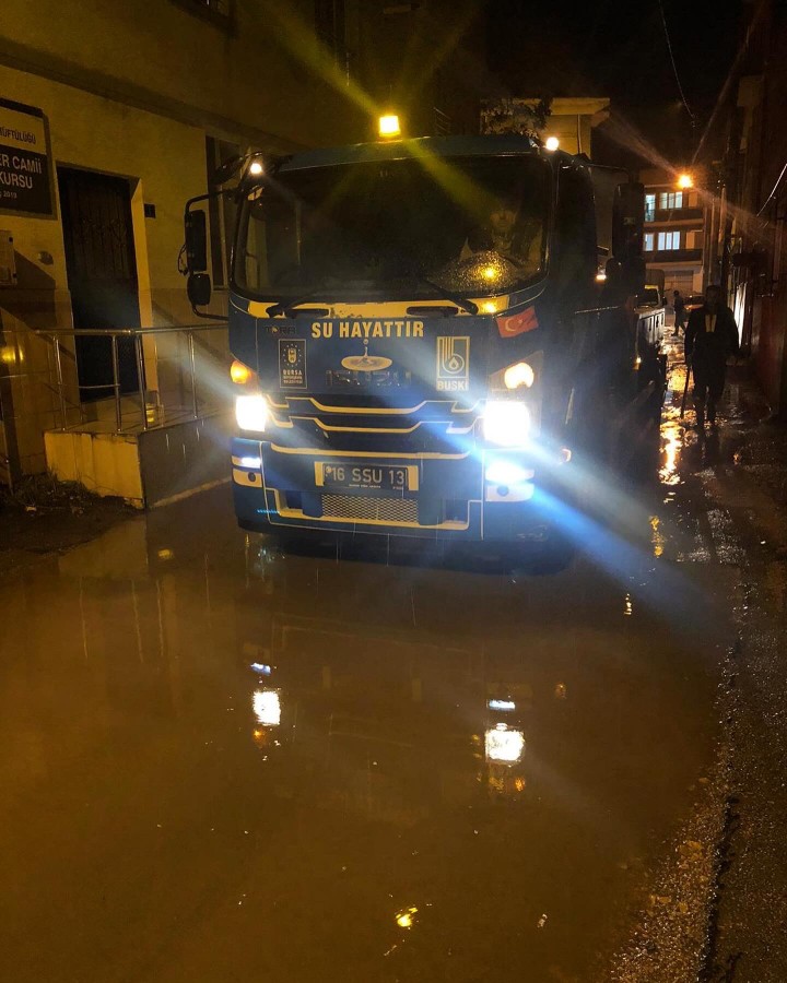 Bursa'da etkili olan sağanak yağış sebebiyle mağduriyet yaşanan bölgelerde BUSKİ ekipleri gece saatlerinde de çalışmalarını sürdürüyor.