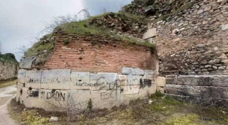 Bitinya, Roma, Selçuklu ve Osmanlı medeniyetlerine ev sahipliği yapan tarihî surlara kimliği belirsiz kişi ya da kişilerce sprey boyalarla yazılar yazıldı.
