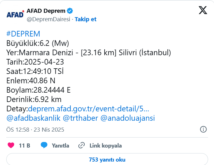 AFAD depremin büyüklüğünü 6.2 olarak açıkladı.