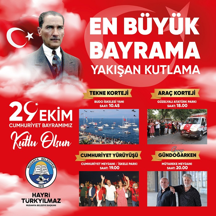 Türkiye Cumhuriyeti'nin kuruluş temellerinin atıldığı Mudanya'da 29 Ekim Cumhuriyet Bayramı bu yıl da coşkuyla kutlanacak. Mudanya Belediyesi, Cumhuriyetin ilanının 98'inci yıl dönümünü, geleneksel "Cumhuriyet Yürüyüşü" ve konserle kutlayacak. Kutlamalar 28 Ekim 13.00'de Atatürk Anıtı'na çelenk sunma töreniyle başlayacak. 29 Ekim saat 10.00'da Mudanya Kaymakamlığı'ndaki resmi programın ardından Mütareke Meydanı'ndan İskele Meydanı'na bayram yürüyüşü gerçekleştirilecek. Kutlamalar kapsamında 29 Ekim sabahı 10.45'te tekne korteji düzenlenecek. Saat 18.00'de Güzelyalı Atatürk Parkı'ndan başlayacak araç kortejinin ardından saat 19.00'da İskele Meydanı'ndan Mütareke Meydanı'na kadar Cumhuriyet Yürüyüşü yapılacak. Yürüyüşün ardından Mütareke Meydanı'nda 20.00'de Grup Gündoğarken sahne alacak. Mudanya Belediye Başkanı Hayri Türkyılmaz, "Cumhuriyetin doğduğu kent Mudanya'da en büyük bayramımızda yine aynı coşku ve gururla Mudanya'da buluşalım" diyerek, Bursalıları Mudanya'daki kutlamalara davet etti.