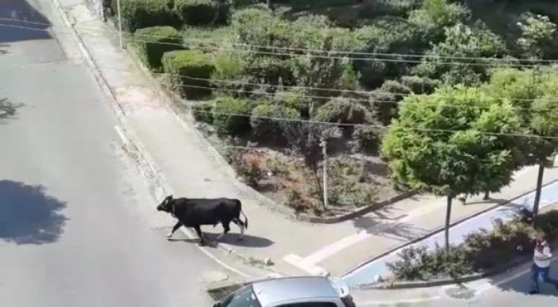 Otomobille önü kesilen dana, ara sokaklara girdi.