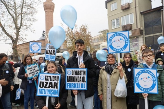 Tüm Türkiye'de olduğu gibi Bursa'da da diyabete dikkat çekmek amacıyla 14 Kasım Dünya Diyabet Günü'nde çeşitli etkinlikler düzenlendi. Bursa Büyükşehir Belediyesi Sağlık İşleri Dairesi Başkanlığı Halk Sağlığı ve Sağlıklı Yaşam Şube Müdürlüğü ile Bursa Tip 1 Diyabetliler Derneği işbirliğinde farkındalık oluşturmak amacıyla yürüyüş düzenlendi. Büyükşehir Belediyesi Bandosu eşliğinde Cumhuriyet Caddesi'nde yürüyen çocuklara, Büyükşehir Belediyesi Genel Sekreter Yardımcısı Mehmet Emin Direkçi, Sağlık İşleri Dairesi Başkanı Düşünsel Şentürk, Bursa Tip 1 Diyabetliler Dernek Başkanı Yadigar Aydın, Bursa Uludağ Üniversitesi Tıp Fakültesi Dekan Yardımcısı Prof. Dr. Erdal Eren ve aileler eşlik etti.