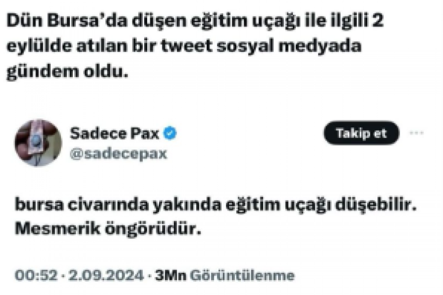 Paylaşımda, ''Bursa civarında yakında eğitim uçağı düşebilir. Mesmerik öngörüdür'' ifadelerini kullanan sosyal medya kullanıcısı herkesin kafasında soru işareti oluşturdu.