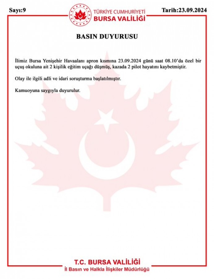 Bursa Valiliği tarafından kaza ile ilgili yapılan açıklamada, "İlimiz Bursa Yenişehir Havaalanı apron kısmına 23.09.2024 günü saat 08.10'da özel bir uçuş okuluna ait 2 kişilik eğitim uçağı düşmüş, kazada 2 pilot hayatını kaybetmiştir. Olay ile ilgili adli ve idari soruşturma başlatılmıştır. Kamuoyuna saygıyla duyurulur" ifadelerine yer verildi.