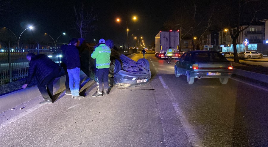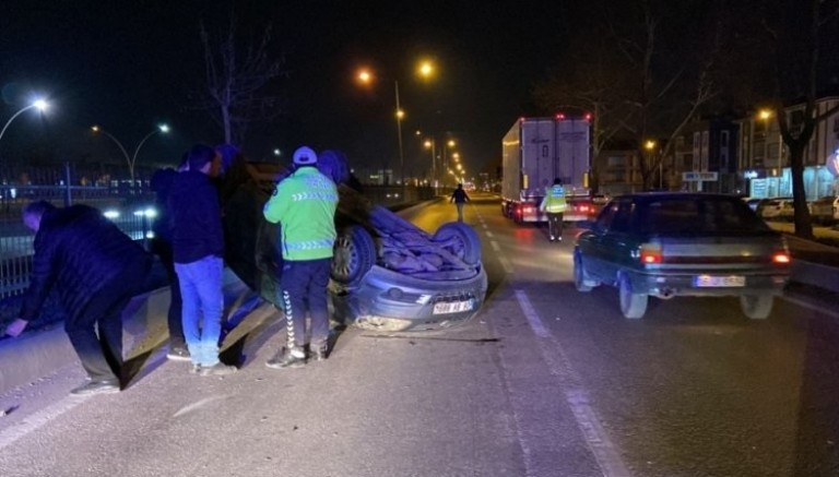 Edinilen bilgiye göre, Bursa'dan İnegöl'e seyir halinde olan Berat G. (30) yönetimindeki 06 BV 8894 plakalı otomobil, aynı yöne seyir halinde olan Bülent Y. (55) yönetimindeki 26 VZ 851 plakalı tır ile çarpıştı. Çarpışmanın etkisiyle kontrolden çıkan otomobil, refüjdeki koruma demirlerine çarparak takla attı. Otomobilin çarptığı koruma demirleri yerinden fırlayarak karşı yönde seyir halinde olan Bülent S. (51) yönetimindeki 34 BUR 900 plakalı otomobilin ön camına saplandı. Kazada sürücü Bülent S. hafif şekilde yaralandı.