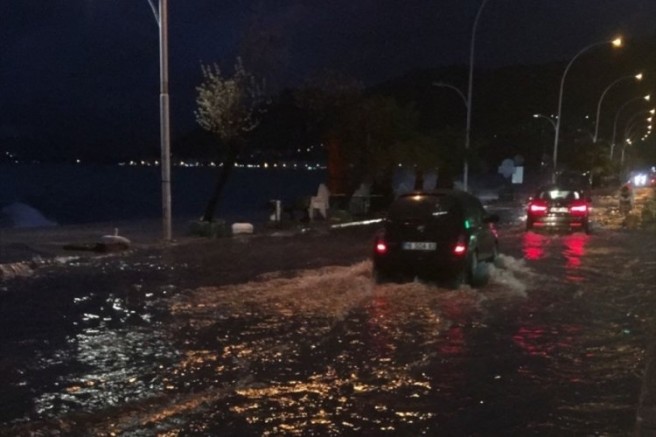 Kuvvetli fırtına sebebiyle esnaf zor anlar yaşarken, dalgaların yükseldiği Kumla ve Kurşunlu mahallelerinde taşkınlar yaşandı.
