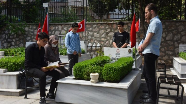 Şehit aileleri ile birlikte Pınarbaşı Garnizon Şehitliği’ni ziyaret eden gençler, milletin bekası, devletin devamı için kendi hayatlarını hiçe sayarak şehadete ulaşan şehitler için Kur’an-ı Kerim okudu.