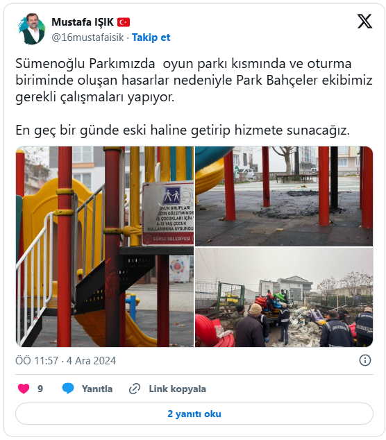 Sümenoğlu Parkımızda oyun parkı kısmında ve oturma biriminde oluşan hasarlar nedeniyle Park Bahçeler ekibimiz gerekli çalışmaları yapıyor. En geç bir günde eski haline getirip hizmete sunacağız.
