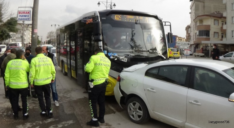 Bursa'nın İnegöl İlçesinde meydana gelen kazada önünde seyir halinde olan otomobile arkasında gelen halk otobüsü çarptı. Kazada otomobil sürücü hafif şekilde yaralanırken kaza anı bir işyerinin güvenlik kamerasına yansıdı.