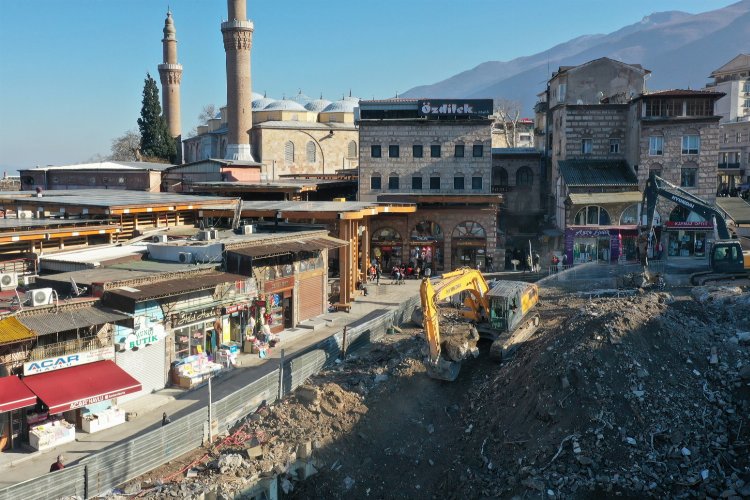 BURSA (İGFA) - Osmanlı'nın ilk başkenti olan Bursa'da 14. yüzyılda oluşmaya başlayan, 16. yüzyılda han, bedesten ve çarşıların oluşumuyla gelişimini tamamlayan Tarihi Çarşı ve Hanlar Bölgesi’ni eski ihtişamına kavuşturacak projede yıkım çalışmaları tamamlandı.