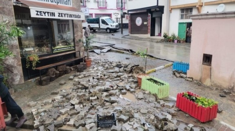 Öte yandan Mudanya ilçesi tarihi Tirilye Mahallesi'nde sağanak yağış sele dönüştü. Caddeler adeta göl halini alırken, azgın sular kaldırım taşlarını söktü. Bazı ev ve işyerleri de sular altında kaldı.