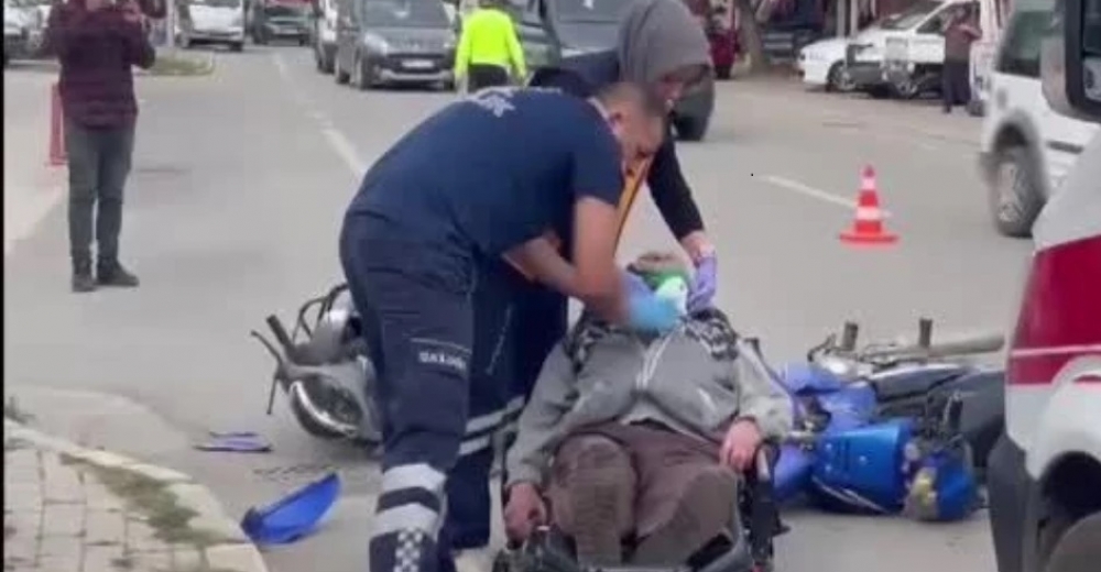 Kazada motosikletlerinden düşen sürücüler asfalt zemine savrularak yaralandılar.
