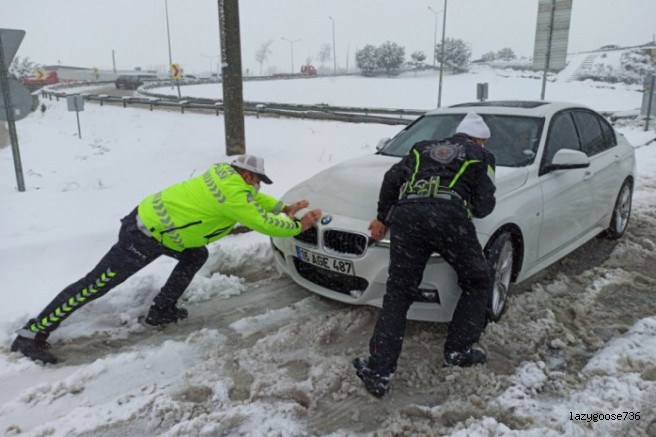 Yaklaşık 1 saattir kapalı olan yolda kar küreme çalışmaları devam ediyor. Öte yandan tedbirsiz yola çıkarak yolda kalan araç sürücülerinin yardımına ise görevli polis ekipleri koştu. Bazı araçlar, polis ekiplerinin iterek yardım etmesiyle hareket edebildi.