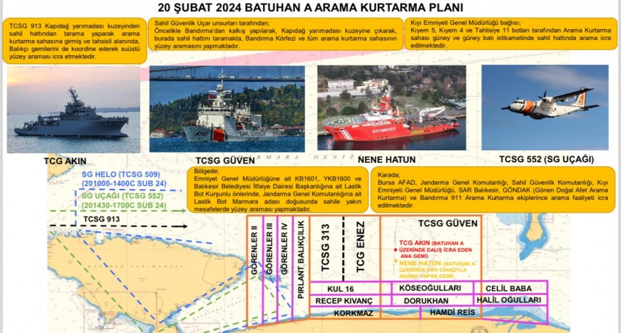 Arama çalışmalarına Türk Silahlı Kuvvetlerinin (TSK) Sualtı Savunma (SAS) komandolarından 4 dalgıç destek veriyor. Toplam 30 dalgıç bölgede arama kurtarma çalışmaları gerçekleştiriyor. Karacabey ve Balıkesir'in Bandırma ilçelerinde limanlarda bulunan yaklaşık 13 balıkçı teknesi kendilerine belirlenen bölgede kıyıdan 3,5 mil açıkta arama-tarama çalışmaları yaparak destek veriyor. TCG Akın gemisinin ise kıyıdan yaklaşık 5.5 mil açıklıkta faaliyet yürüttüğü öğrenildi. İl Jandarma Komutanlığına bağlı timler sahil kesimlerinde yaya olarak arama çalışmaları yapıyor.