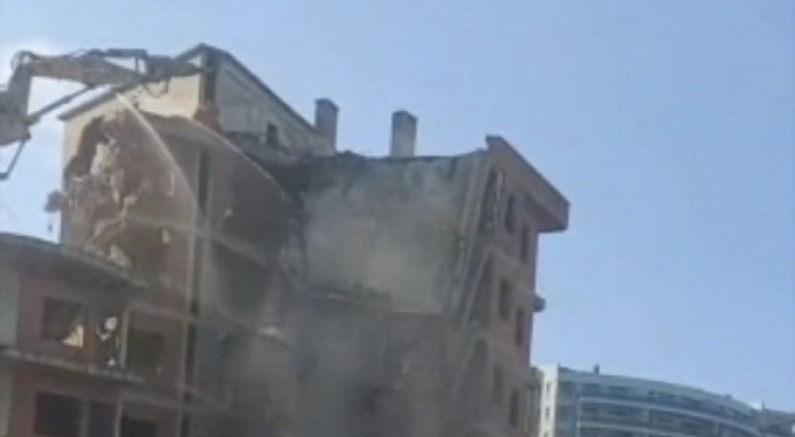 Çevreye tehlike saçan bina, ekiplerin güvenlik önlemleri altında yıkımına başlandı. Kepçe operatörü binaya değdiği anda bina, büyük gürültüyle yıkıldı.