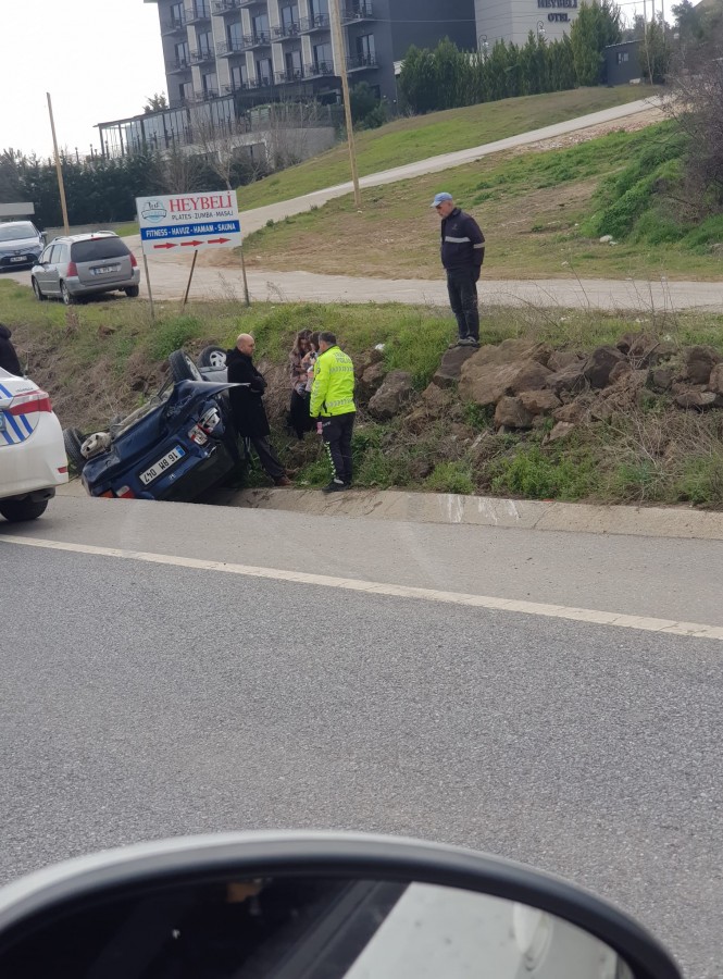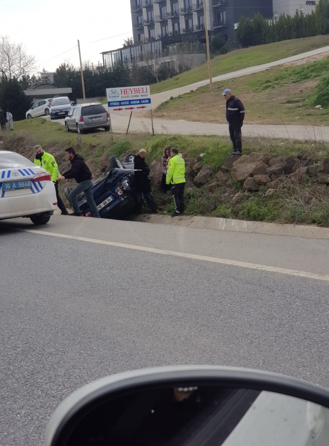 Kaza, öğle saatlerinde Bursa-Mudanya yolu Heybeli otel önünde meydana geldi. Edinilen bilgiye göre, 16 BM 047 plakalı aracın sürücüsü kontrolünü kaybetmesi sonucu takla attı. Polis ekipleri kazayla ilgili tahkikat başlattı.
