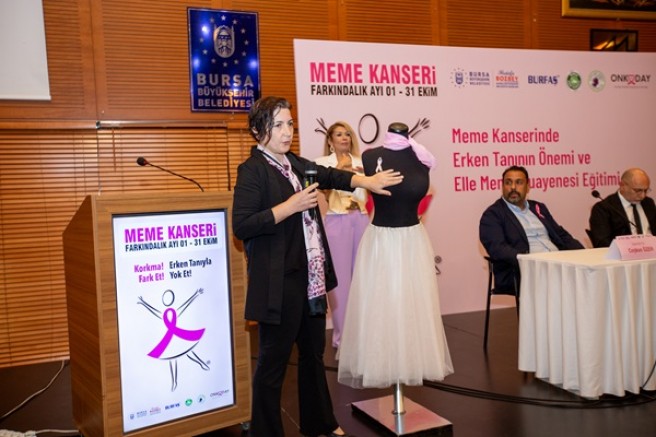 Bursa Büyükşehir Belediyesi, Bursa Kent Konseyi Kadın Meclisi, BURFAŞ ve Onkoday (Uludağ Onkoloji Dayanışma Derneği) iş birliğiyle Merinos AKKM - Hüdavendigar Salonu’nda gerçekleştirilen etkinlikte meme kanseri farkındalığını artırmak amacıyla uzman doktorlar tarafından eğitim verildi. Etkinlikte katılımcılara, meme kanserinin erken teşhisi için kendi kendine meme muayenesinin nasıl yapılacağı da anlatıldı.