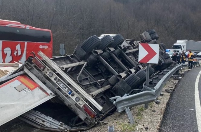 Ömer Doğan idaresindeki 16 PK 036 plakalı tır, Mezitler bölgesinde seyir halindeyken kontrolden çıkıp bariyerleri aşarak devrildi.