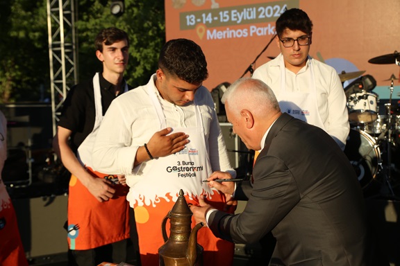Bursa’nın gastronomi kültürünü ortaya çıkarmak amacıyla zengin bir içerikle hazırlanan ve Cumhuriyet Caddesi’nden Atatürk Stadyumu Caddesi’ne kadar uzanan renkli kortejle start alan 3. Bursa Uluslararası Gastronomi Festivali’nin resmi açılış töreni, adeta dev bir mutfağa dönüşen Merinos Park’ta yapıldı. Festival alanının girişindeki kurdele kesilmesiyle başlayan festivalin açılış törenine, Bursa Büyükşehir Belediye Başkanı Mustafa Bozbey ve eşi Seden Bozbey’in yanı sıra Vali Yardımcısı Rıza Gençoğlu, Bursa Milletvekili Nurhayat Altaca Kayışoğlu, CHP İl Başkanı Nihat Yeşiltaş, Türkiye Esnaf ve Sanatkârları Konfederasyonu Genel Başkanı Bendevi Palandöken, Bursa milletvekilleri, BESOB Başkanı Fahrettin Bilgit, ilçe belediye başkanları, Büyükşehir Belediyesi bürokratları, gastronomi profesyonelleri, şefler, gastronomi öğrencileri ve vatandaşlar katıldı.