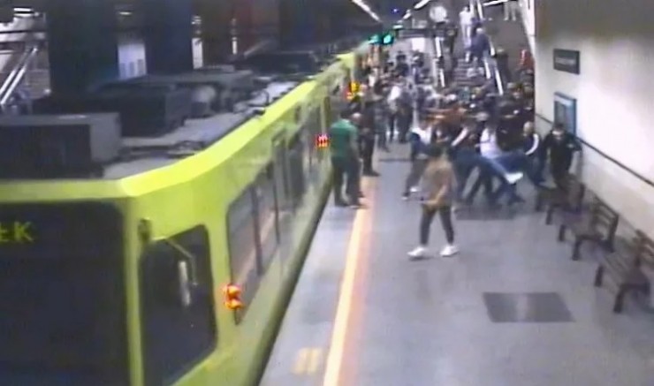 Öte yandan, metronun güvenlik kamerasına yansıyan görüntülerde bir grubun sigara içerek metroya bindiği, bir süre sonra bir başka grup tarafından metrodan indirildikleri ve iki grubun tekme tokat kavgaya tutuştukları görüldü.