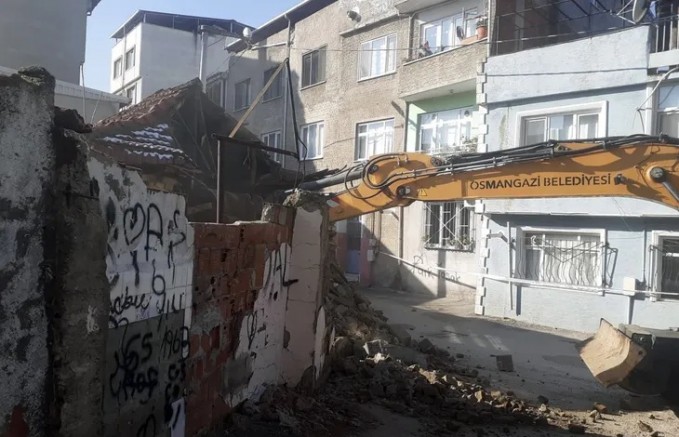Osmangazi Belediyesi, ilçe genelinde tespiti yapılan ve yasal prosedürleri tamamlanan metruk binaları yıkmaya devam ediyor.