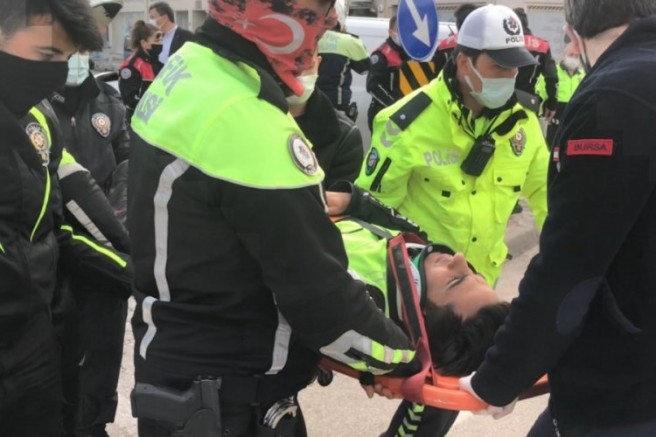 Çarpışma sonucu polis memuru Kayhan K., savruldu. Savrulma sonucu polis memuru yaralanırken, olay yerine çok sayıda polis ve sağlık ekibi sevk edildi.