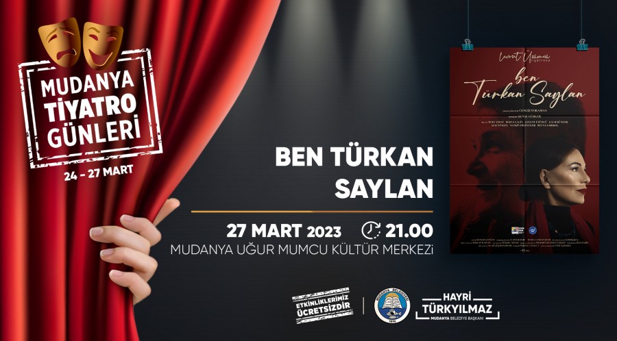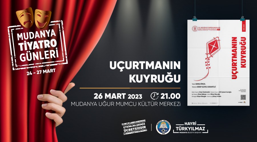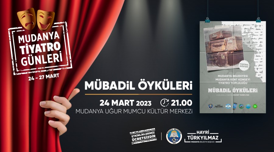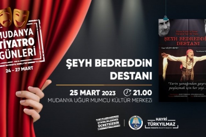 Mudanya Belediyesi, 24-27 Mart tarihlerinde 4 farklı oyunu tiyatroseverlerle buluşturuyor. Mudanya Tiyatro Günleri kapsamında 24 Mart Cuma günü Mudanya Kent Konseyi'nin "Mübadil Öyküleri", 25 Mart Cumartesi günü Canım Tiyatro Topluluğu'nun "Şeyh Bedreddin Destanı", 26 Mart Pazar günü Bursa Devlet Tiyatrosu'nun "Uçurtmanın Kuyruğu", 27 Mart Pazartesi günü ise Levent Üzümcü Tiyatrosu'nun "Ben Türkan Saylan" adlı oyunları saat 21.00'da ücretsiz olarak Uğur Mumcu Kültür Merkezi'nde seyirciyle buluşacak.