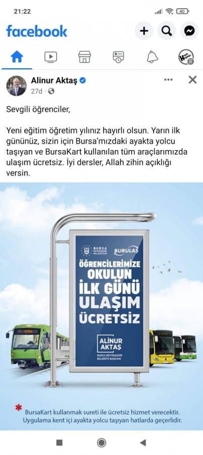Bursa Büyükşehir Belediye Başkanı Alinur Aktaş sosyal medya hesabından yaptığı paylaşımda "Sevgili öğrenciler, yeni eğitim öğretim yılınız hayırlı olsun. Yarın ilk gününüz, sizin için Bursa'mızdaki ayakta yolcu taşıyan ve BursaKart kullanılan tüm araçlarımızda ulaşım ücretsiz. İyi dersler, Allah zihin açıklığı versin" ifadelerini kullandı.