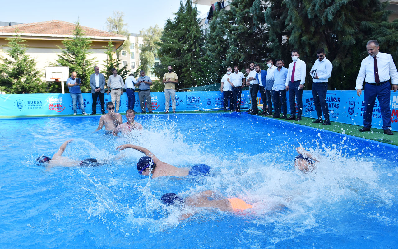 Gençlik ve Spor Hizmetleri Dairesi Başkanlığı koordinasyonunda hayata geçirilen ‘Neşeli Havuzlar, Mutlu Çocuklar’ projesi kapsamında Osmangazi, Nilüfer, Yıldırım, Mudanya, Yenişehir, Orhangazi ve Mustafakemalpaşa’da okul bahçelerine portatif yüzme havuzu kuruldu. Yarı olimpik yüzme havuzlarına yakın olarak 12x24 metre ebatlarında ve 1.20 metre derinliğindeki havuzlarda 25 Ağustos’a kadar devam edecek proje kapsamında uzman eğitmenlerle 6-13 yaş aralığındaki çocuklara ücretsiz yüzme eğitimi alıyor