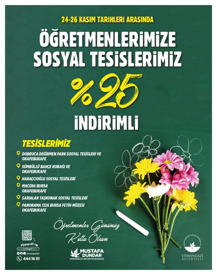 Eğitime yaptığı destek ve yatırımlarla ön plana çıkan Osmangazi Belediyesi, öğretmenleri unutmadı. Belediyenin ilçede hizmet veren Dobruca Değirmen Park, Sümbüllü Bahçe Konağı, Haraççıoğlu Sosyal Tesisleri, Macera Bursa, Sarıalan Taş Konak Sosyal Tesisleri, Panorama 1326 Fetih Müzesi ve tesislerde bulunan O Kafe Bu Kafe noktalarında 24 Kasım Öğretmenler Günü'ne özel tüm öğretmenlere 24-26 Kasım tarihleri arasında yüzde 25 indirim uygulanıyor.