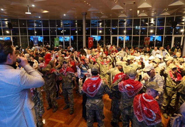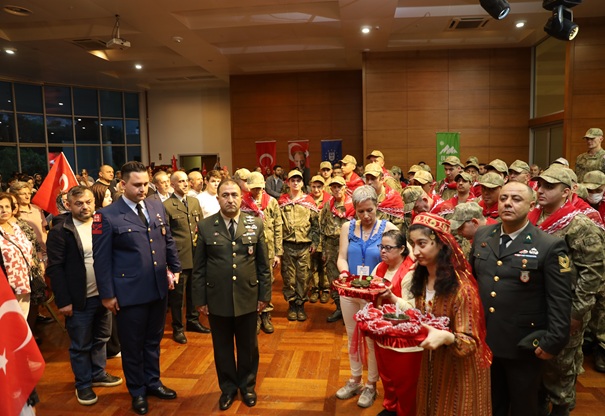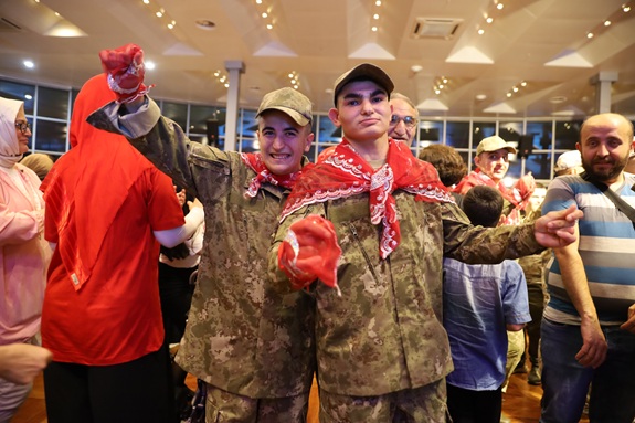 Dev Türk bayrağı açarak salona giren asker adayları, bando eşliğinde marşlarla yürüyüş yaptı. Engelli genç kızların kına tepsilerini taşıdığı yürüyüş, Türk bayrağının dalgalandırılmasıyla sona erdi. Saygı duruşu ve İstiklal Marşı’nın okunduğu programda protokol üyeleri, gençlerin eline kına yaktı. Duygusal anlar yaşayan aileler, asker kıyafeti içerisindeki çocuklarıyla bol bol hatıra fotoğrafı çektirdi. Hem üniforma giymenin heyecanını yaşayan hem de Büyükşehir Belediyesi orkestrası eşliğinde doyasıya eğlenen asker adayları, Türk bayrağı işlemeli yazmaları omuzlarına takarak aileleriyle unutamayacakları bir akşam yaşadı.