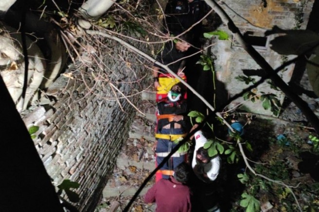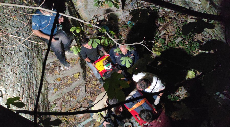 Ekipler, Akman'ı düştüğü ağaçlık ve metruk binalar arasından sedye ile zorlukla çıkardı.