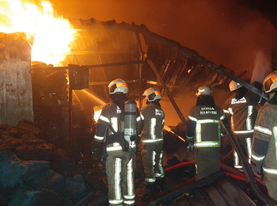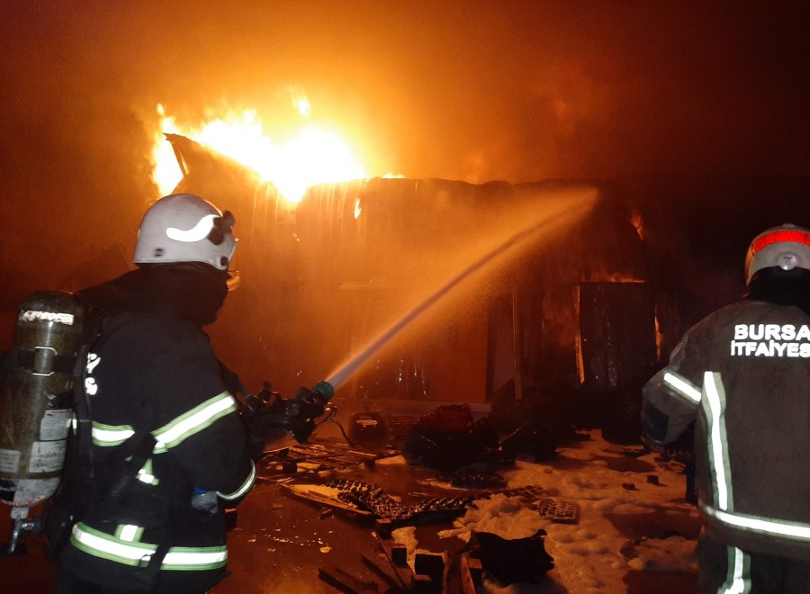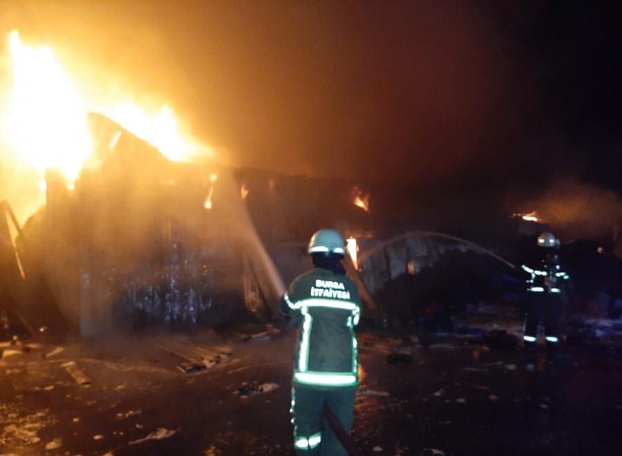 Bursa Büyükşehir Belediyesi İtfaiye Daire Başkanlığı'na bağlı ekipler de ihbar üzerine bölgeye sevk edildi. Fabrikadan gökyüzüne yükselen alevler ilçenin bir çok noktasından görülüyor. O anlar drone ile havadan da görüntülendi.