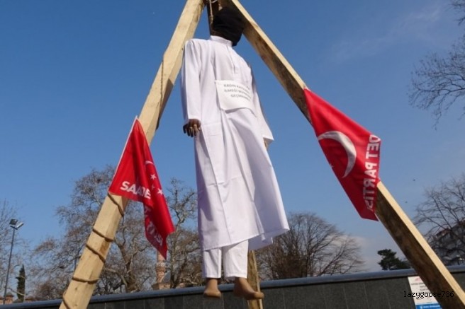 Saadet Partisi Bursa İl Gençlik Kolları üyeleri, Orhangazi Parkına darağacı kurup, cansız mankeni idam etti. 8 Mart Dünya Kadınlar Gününde kadın cinayetlerine dikkat çekmek isteyen partililer, "İdam cezası çıksın, kadın katilleri idam edilsin" diyerek, darağacına asılan mankeni idam etti.