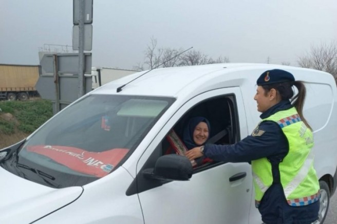 Bursa İl Jandarma Komutanlığı Trafik Şube Müdürlüğü Ekipleri, kadın sürücülerin 8 Mart Dünya Kadınlar Günü'nü kutladı. Aralarında kadın jandarmalarında bulunduğu ekipler kadınlar gününe özel kadın sürücülere çiçek dağıttı.