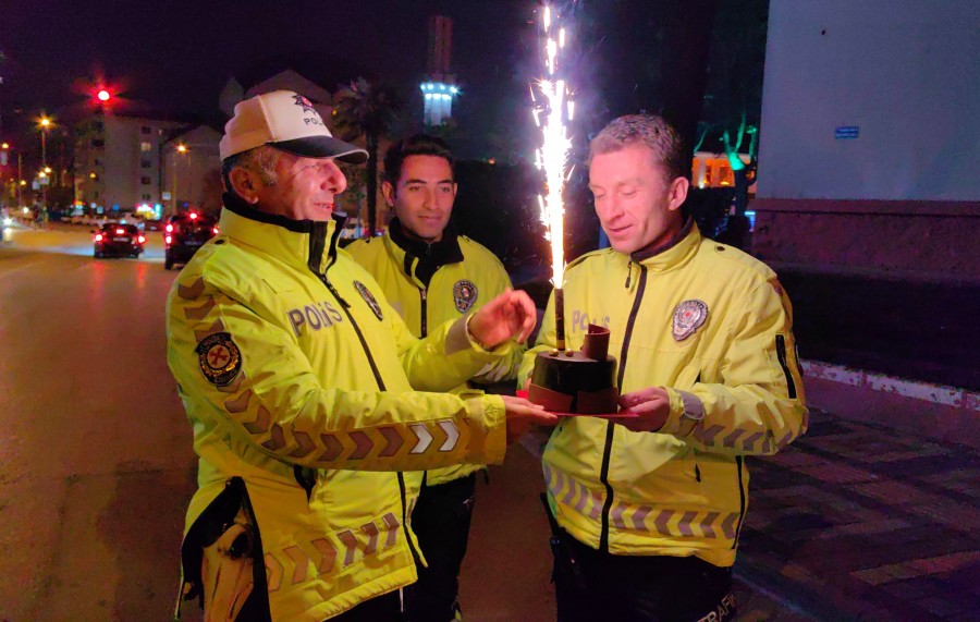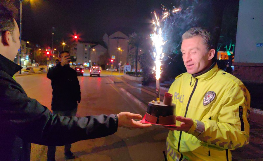 Sürücü, kendisini durduran polis ekiplerine pastalı sürpriz yaptı. Şaşıran polis ekipleri, pasta üzerindeki mumları söndürüp teşekkür ettiler. Sürücü Burak Oynalı, polis ekiplerinin bu özel gününü kutladı.