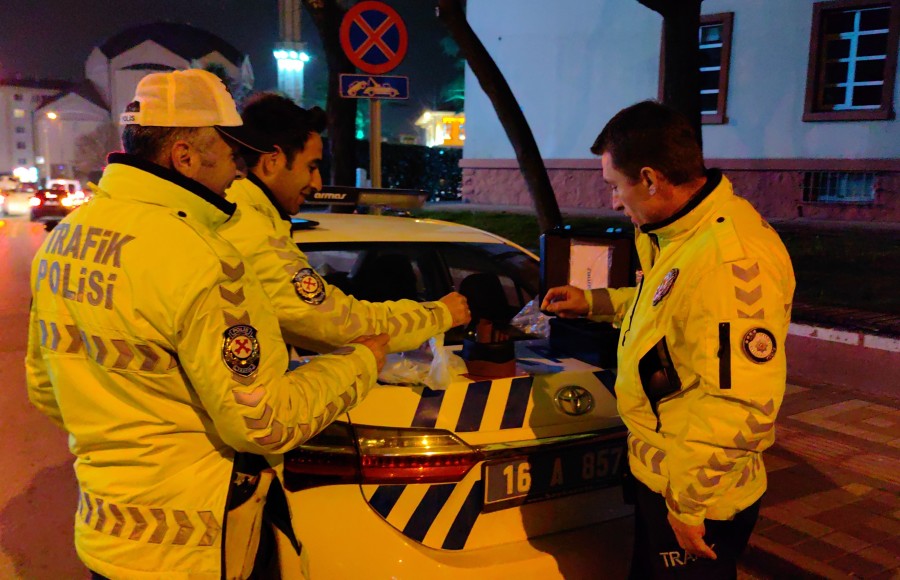 Bir araç sürücüsü Burak Oynalı, Emniyet Genel Müdürlüğünün kuruluşunun 178'inci yıl dönümü ve "Polis Haftası" kapsamında İnegöl'de uygulama yapan polis ekiplerine sürpriz yapmak istedi. Pasta alan sürücü, Cuma Mahallesi, Nuri Doğrul Caddesi üzerinde uygulama yapan trafik ekiplerine yöneldi. Sürücü, polis ekiplerince uygulama noktasında durduruldu.