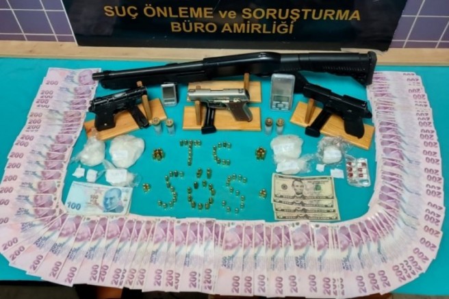Girilen adreste İ.C. isimli şahsın ruhsatsız ateşli silahlarla ve mermileri satın alma veya taşıma veya bulundurma suçundan, D. S. K.'nın hırsızlık, A. K.'nın bilişim sistemleri yoluyla dolandırıcılık, Y. T'nin 2 ayrı dolandırıcılık suçlarından arandıkları tespit edildi. Yapılan operasyonda 288.33 gram metamfetamin, uyuşturucu satışından elde edilen 21 bin 900 TL ve 20 Dolar, 2 adet hassas terazi, 3 adet ruhsatsız tabanca, 24 adet fişek, 1 adet ruhsatsız pompalı tüfek ve 4 adet kartuş ele geçirildi.