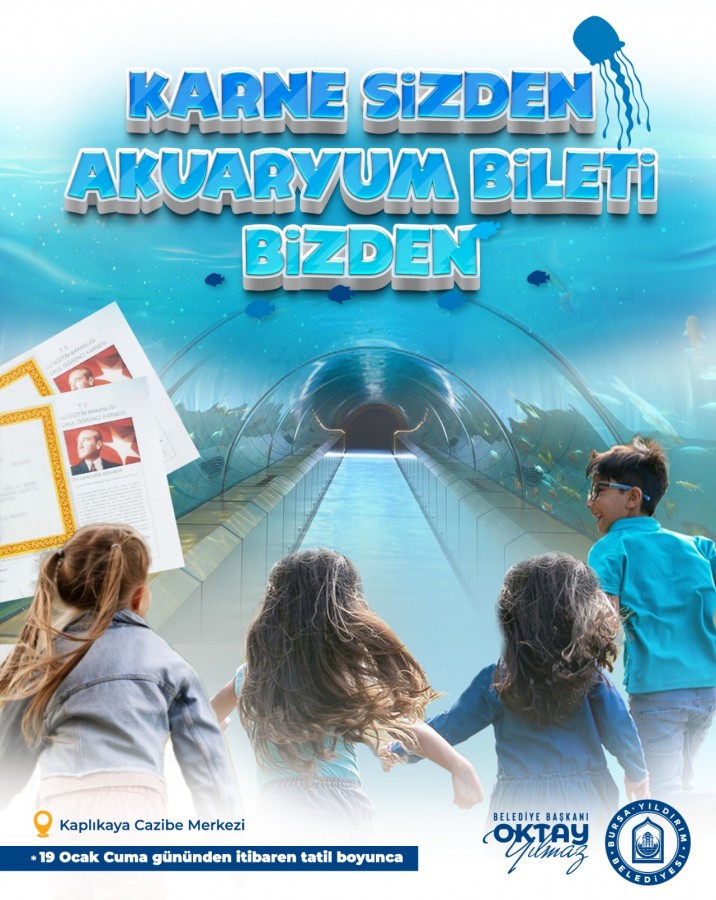Bursa Yıldırım Belediyesi, 'Karne Sizden Akvaryum Bileti Bizden' sloganıyla ara tatil boyunca Cazibe Merkezi Tünel Akvaryumu'nu Yıldırımlı çocukların ücretsiz olarak hizmetine sunuyor. Sömestir tatili boyunca karnelerini getirip tüneli ücretsiz olarak ziyaret etme fırsatı bulabilecek öğrenciler, kentin ilk ve tek tünel akvaryumunda su canlılarını yakından tanıma imkânı bulacak. Bin metrekare alan üzerine kurulu gölet akvaryumda 5 bin yetişkin 20 bin yavru Koi Balığı bulunuyor. Yaklaşık 25 metre uzunluğunda olan su tünel akvaryumunun giriş kısmındaki iç akvaryumda timsah balığı, kırmızı kuyruk kedi balığı, vatoz gibi su canlıları da bulunuyor. Yoğun bir eğitim-öğretim dönemini geride bırakan öğrencileri kutlayan Yıldırım Belediye Başkanı Oktay Yılmaz, "Eğitim dönemi boyunca hep yanında ve destekçisi olduğumuz çocuklarımızı sömestr tatilinde de unutmuyoruz. Tüm çocuklarımızı bir dönemin yorgunluğunu atmaları ve su canlılarını yakından tanımaları için Cazibe Merkezi Tünel Akvaryuma bekliyoruz" dedi.