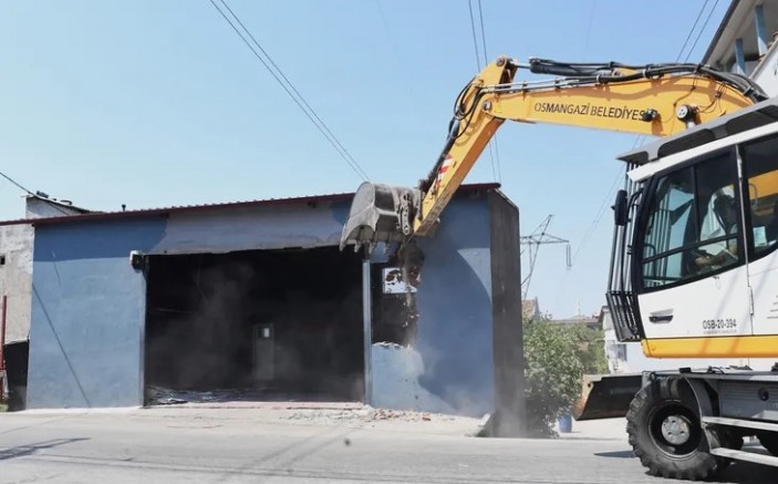 Osmangazi Belediyesi, ilçenin dört bir yanındaki kaçak binaları tespit ederek yıkıyor. Yapı Kontrol Müdürlüğü ekipleri tarafından Geçit Mahallesi'nde ruhsatsız olduğu belirlenen iş yeri, yasal işlemlerinin tamamlanmasının ardından iş makinesi ile yıkıldı.