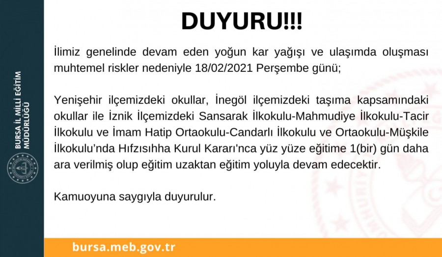 Açıklamada İnegöl ilçesinde taşımalı eğitim kapsamındaki okullar ile İznik'teki Sansarak, Mahmudiye, Tacir, Candarlı ve Müşkile mahallelerindeki okullarda da yarın yüz yüze eğitimin olmayacağı duyuruldu.