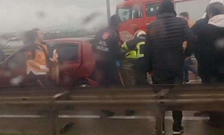 Frene basan kamyon sürücüsü yağışlı havanın etkisiyle duramayarak önündeki araçlara çarptı.