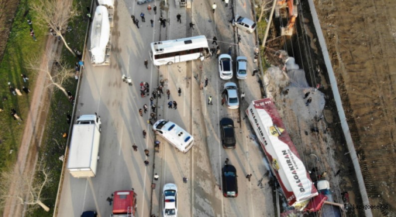 4 kişinin öldüğü 2'si ağır 34 kişinin yaralandığı kazaya sebep olan TIR'ın yeni görüntüleri ortaya çıktı. Faciadan saniyeler önce çekilen görüntülerde Akiniş rampasında freni patlayan TIR'ın son sürat yokuş aşağı indiği anlar arkasından gelen bir başka sürücü tarafından kaydedildi. O anları kaydederken TIR'ın freninin patlamış olabileceğinden bahseden sürücü kendisinin 100 kilometre hızla seyrettiği halde TIR'a yetişemediğini, tırın 4'lü flaşörlerini yaktığını anlattı.