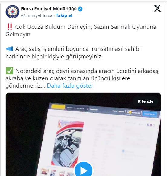 "Çok ucuza buldum demeyin, sazan sarmalı oyununa gelmeyin araç satış işlemleri boyunca ruhsatın asıl sahibi haricinde hiçbir kişiyle görüşmeyiniz. Noterdeki araç devri esnasında aracın ücretini arkadaş, akraba ve kuzen olarak tanıtılan üçüncü kişilere göndermeniz isteniyorsa dolandırılıyor olabilirsiniz. Dikkatli olalım... Birikimlerimizi dolandırıcılara kaptırmayalım."