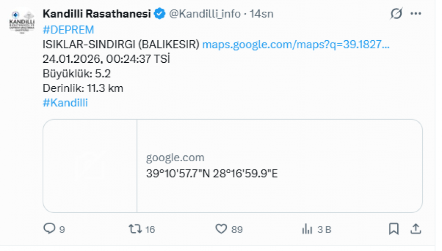 Kandilli Rasatahnesi 5,2 büyüklüğünde saat 00,24'te meydana gelen depremin yerin 11,3 kilometre altında gerçekleştiği bilgisini paylaştı.