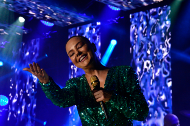 Ebru Gündeş ,"Teşekkür Ederim", "Kızıl Mavi" ve "Demir Attım Yalnızlığa" gibi sevilen şarkılarını hayranlarıyla birlikte söyledi.
