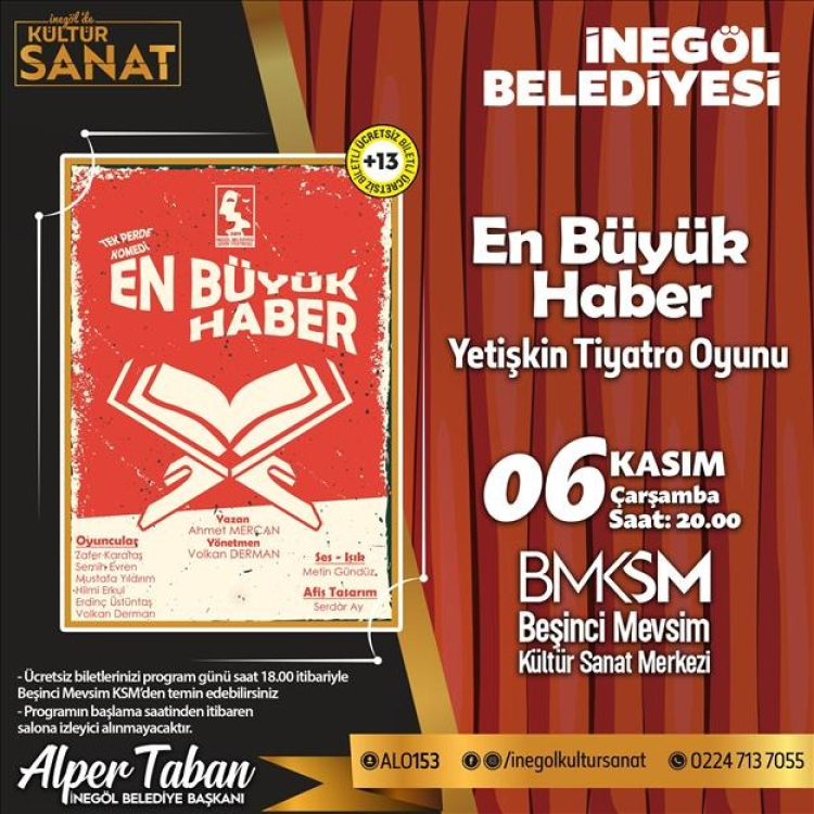 06 Kasım Çarşamba akşamı İnegöl Belediyesi Şehir Tiyatrosunun son oyunu “En Büyük Haber” tiyatro gösterisi 20.00’da İnegöl’de kültür ve sanatın merkezi haline gelen Beşinci Mevsim Kültür Sanat Merkezinde sahnelenecek. 09 Kasım Perşembe günü Bursa Olgunlaşma Enstitüleri iş birliğinde hazırlanan “Hayra Açılan Kapılar” isimli Kapı Tokmakları Sergisi 14.00’da İnegöl Kent Müzesi Serdar Rubacı Sergi Salonunda izlenime sunulacak. 08 Kasım Cuma akşamı 20.30’da Aile Hayatı İyileştirme Derneği (AHİD) iş birliğinde düzenlenen Aile Okulu seminerleri kapsamında Aile Koçu Münir Arıkan’ın “Ailede Şahsiyet Eğitimi” semineri Sani Konukoğlu Konferans Salonunda gerçekleştirilecek. 09 Kasım Cumartesi günü 14.00’da Beşinci Mevsim KSM’nde “Oyun Arkadaşım” isimli çocuk tiyatrosu 6-12 yaş arası çocuklar için minik sanatseverlerle buluşacak. 15 Kasım Cuma akşamı Aile Okulu programları kapsamında Psiko-Hekim Abdülaziz Yılmaz’ın “Örnek ve Rol Model Anne Baba Olmak” semineri 20.30’da Sani Konukoğlu Konferans Salonunda gerçekleştirilecek. 16 Kasım Cumartesi günü 14.00’da “Rüyanın Rüyası” çocuk tiyatro gösterisi Beşinci Mevsimde gerçekleştirilecek. 22 Kasım Cuma akşamı Aile Okulu programları kapsamında Eğitimci İlahiyatçı Hasan Basri Balcı’nın “Huzurlu Aile ve Fetih Nesli” semineri 20.30’da Sani Konukoğlu Konferans Salonunda gerçekleştirilecek. 23 Kasım Cumartesi günü 14.00’da “Karagözün Dişi” gölge oyunu çocuklar için Beşinci Mevsim KSM’nde sahnelenecek. 27 Kasım Çarşamba akşamı 20.00’da Beşinci Mevsim KSM’nde İnegöl Belediyesi Türk Sanat Müziği Korosu konseri gerçekleştirilecek. 29 Kasım Cuma akşamı 20.00’da Beşinci Mevsim KSM’nde İnegöl Belediyesi Şehir Tiyatrosunun sahneye taşıdığı “Ayyar Hamza” yetişkin tiyatro gösterisi izleyici ile buluşacak. Yine 29 Kasım Cuma akşamı 20.30’da Sani Konukoğlu Konferans Salonunda Aile Okulu programları kapsamında Eğitimci İsmail Güler’in “Toplumun Çekirdeği Aile” konulu semineri gerçekleştirilecek. 30 Kasım Cumartesi günü ise 14.00’da Beşinci Mevsim KSM’nde yapılacak “Mimdo’nun Aradığı Çocuk” isimli çocuk tiyatro gösterisi ile Kasım ayı etkinlikleri tamamlanmış olacak.