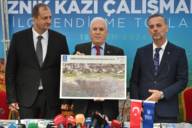 2014 yılında keşfedilen Su Altı Bazilikal Kilisesi’nin inanç tarihinde önemli bir yere sahip olduğunu ifade eden Başkan Bozbey, “Bu keşif, aynı yıl içerisinde Amerika Arkeoloji Enstitüsü tarafından yayımlanan ‘Arkeoloji Magazin’ isimli dergi tarafından 2014 yılının en önemli 10 keşfi arasında gösterilmiştir. Prof. Dr. Mustafa Şahin’in kazı başkanlığında çalışmalar devam etmektedir. Bursa Büyükşehir Belediyesi olarak çalışmaların devam etmesine katkı sağlıyoruz. Su Altı Bazilikal Kilisesi, Birinci Konsil’in kabulünün 1700’üncü yılı olan 2025 yılında ziyaretçilerine kapılarını açacaktır. 2025 yılı İznik ve Bursa için önemli bir yıldır. Dünyada İznik’in ve Bursa’nın yerinin önemli olduğu vurgusunu oluşturmalıyız. Bu algıyı oluşturursak bölgeye ve Bursa’ya daha fazla turist gelecektir. Turizm payımız da artacaktır” dedi.